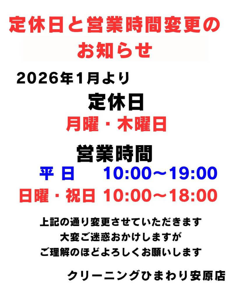 【安原店】定休日と営業時間変更のお知らせ