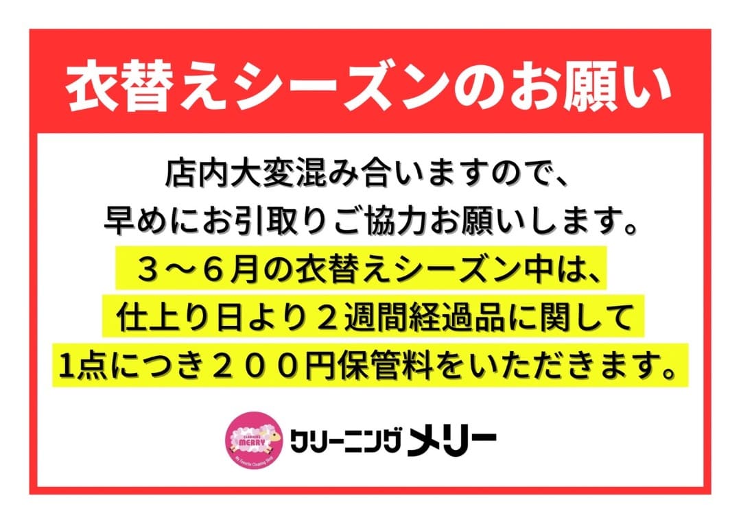 ※衣替えシーズンは早めの引き取りお願いします
