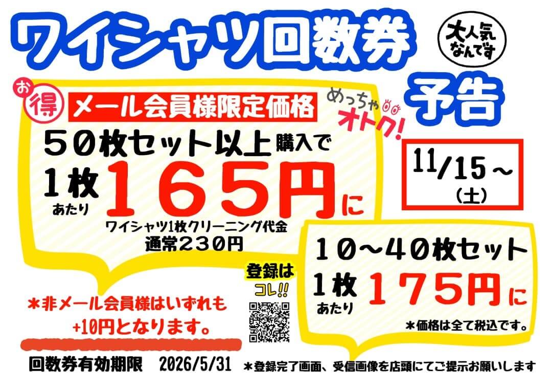 11月15日(土)より、恒例のお得で手軽な『ワイシャツ回数券』を販売開始します!
